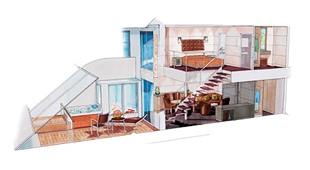 - Tři propojené kajuty (1 vnitřní kajuta a 2 balkónové kajuty), 3 koupelny a 2 balkóny. Až pro 10 cestujících.