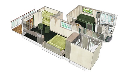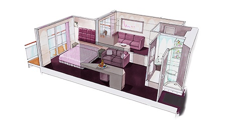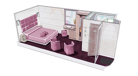 - propojené 2 kajuty (1 vnitřní a 1 balkónová kajuta), 2 koupelny a 1 balkón. Až pro 6 cestujících.