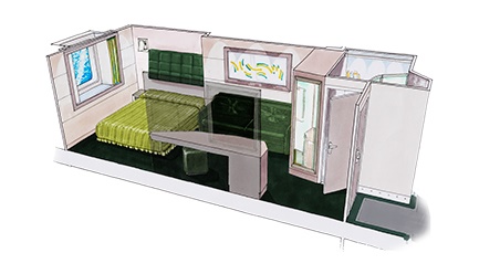- Dvě propojené kajuty (1 vnitřní a 1 vnější s oknem), 2 koupelny. Až pro 6 cestujících.