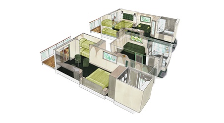 - Propojené dvě kajuty s balkónem, s dvěma koupelnami. Až pro 6 cestujících.