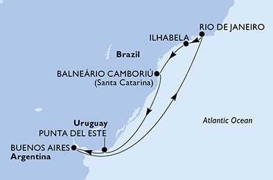 | Den 6 | Camboriu, Brazílie, (připlutí: 09:00 | odplutí: 18:00) |