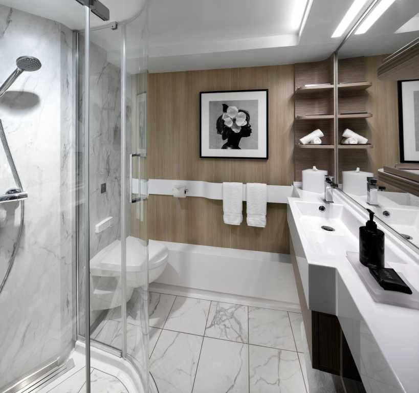 Ubytování v kajutě vybrané kategorie. Kajuty jsou vybavené samostatným sociálním zařízením, klimatizací, TV, minibarem, šatní skříní, kosmetickým stolkem, vysoušečem vlasů, trezorem a telefonem. Přístavní poplatky, portýrské služby při nalodění a vylodění, denní úklidový servis a výhody Vámi zvolené třídy ubytování.
