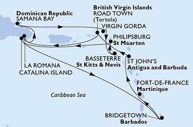 Barbados, Martinik, Antigua a Barbuda, Britské Panenské ostrovy, Dominikánská republika, Zámořské území Velké Británie, Svatý Kryštof a Nevis, Svatý Martin z Bridgetownu na lodi MSC Opera, plavba s bonusem
