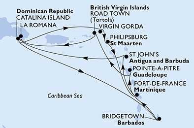 Dominikánská republika, Zámořské území Velké Británie, Martinik, Barbados, Guadeloupe, Svatý Kryštof a Nevis, Britské Panenské ostrovy z La Romany na lodi Costa Fascinosa