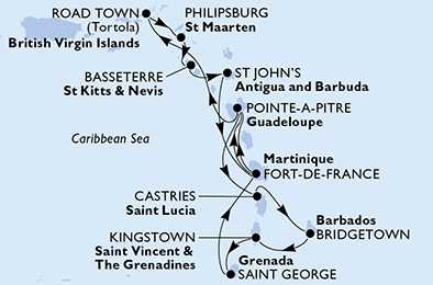 Barbados, Svatý Vincenc a Grenadiny, Grenada, Martinik, Guadeloupe, Britské Panenské ostrovy, Svatý Martin, Svatý Kryštof a Nevis, Antigua a Barbuda, Svatá Lucie z Bridgetownu na lodi MSC Virtuosa, plavba s bonusem
