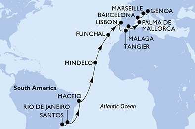 | Den 1 | Santos, Brazílie, (připlutí: --:-- | odplutí: 18:00) |