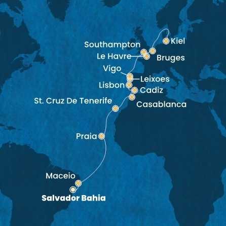 Brazílie, Kapverdy, Španělsko, Maroko, Portugalsko, Francie, Velká Británie, Belgie, Německo ze Salvadoru na lodi Costa Diadema