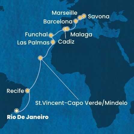 Brazílie, Kapverdy, Španělsko, Portugalsko, Francie, Itálie z Rio de Janeira na lodi Costa Serena