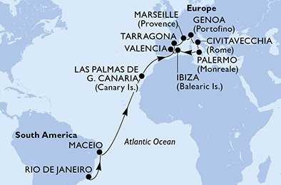 Své plavby MSC Musica zahajuje začátkem roku ve Středozemí a postupně se přesouvá do Jižní Ameriky, ze které se na podzim vrací zpět.