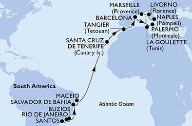 Brazílie, Španělsko, Maroko, Tunisko, Itálie, Francie ze Santosu na lodi MSC Virtuosa