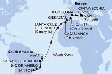 | Den 1 | Santos, Brazílie, (připlutí: --:-- | odplutí: 17:00) |