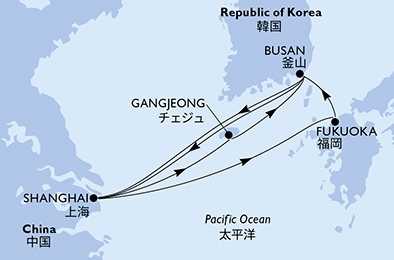 | Den 7 | Gangjeong, Jižní Korea, (připlutí: 14:30 | odplutí: 22:00) |