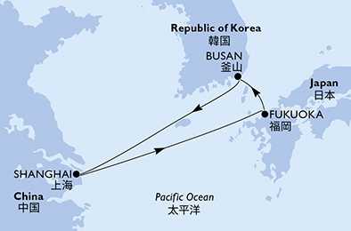 | Den 1 | Šanghaj, Čína, (připlutí: --:-- | odplutí: 17:00) |