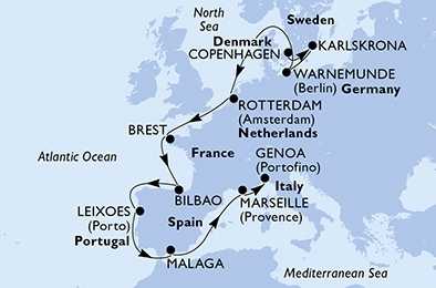 Dánsko, Švédsko, Německo, Nizozemsko, Francie, Španělsko, Portugalsko, Itálie z Kodaně na lodi MSC Magnifica, plavba s bonusem