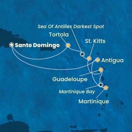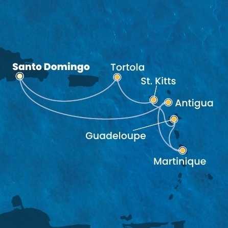 Dominikánská republika, Antigua a Barbuda, Martinik, Guadeloupe, Svatý Kryštof a Nevis, Britské Panenské ostrovy ze Santo Dominga na lodi Costa Favolosa