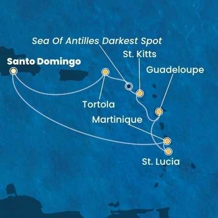 Dominikánská republika, Martinik, Svatá Lucie, Guadeloupe, Svatý Kryštof a Nevis, Britské Panenské ostrovy ze Santo Dominga na lodi Costa Fascinosa