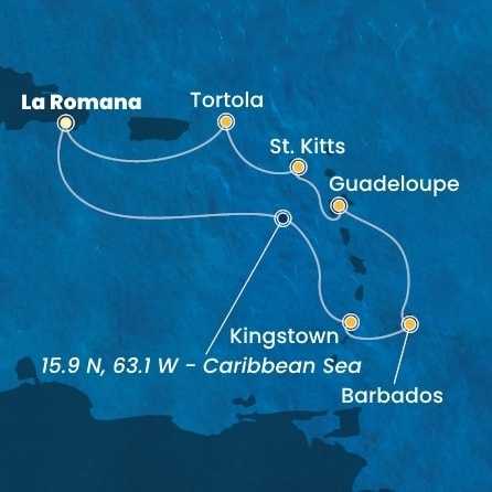 Dominikánská republika, Svatý Vincenc a Grenadiny, Barbados, Guadeloupe, Svatý Kryštof a Nevis, Britské Panenské ostrovy z La Romany na lodi Costa Pacifica