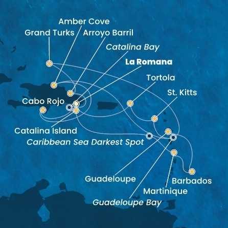 Dominikánská republika, Zámořské území Velké Británie, Martinik, Barbados, Guadeloupe, Svatý Kryštof a Nevis, Britské Panenské ostrovy z La Romany na lodi Costa Fascinosa