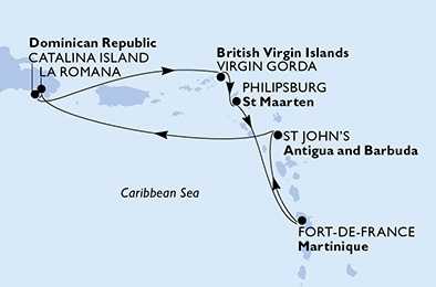 program Den 1 La Romana, Dominikánská republika, (připlutí: --:-- | odplutí: 23:30) Den 2 Catalina, Dominikánská republika, (připlutí: 08:00 | odplutí: 17:00) Den 3 Virgin Gorda, Britské Panenské ostrovy, (připlutí: 11:00 | odplutí: 20:00) Den 4 Philipsburg, Svatý Martin, (připlutí: 08:00 | odplutí: 18:00) Den 5 Fort-de-France, Martinik, (připlutí: 09:00 | odplutí: 19:00) Den 6 St. John, Antigua a Barbuda, (připlutí: 09:00 | odplutí: 19:00) Den 7 Relaxační den na moři Den 8 La Romana, Dominikánská republika, (připlutí: 08:00 | odplutí: --:--)