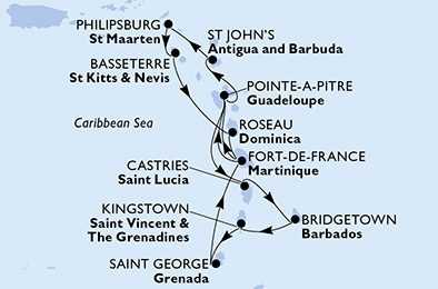 Martinik, Guadeloupe, Svatý Martin, Antigua a Barbuda, Svatý Kryštof a Nevis, Dominika, Barbados, Svatý Vincenc a Grenadiny, Grenada, Svatá Lucie z Fort-de-France na lodi MSC World Europa, plavba s dopravou