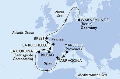 | Den 7 | La Rochelle (Bordeaux), Francie, (připlutí: 07:00 | odplutí: 17:00) |