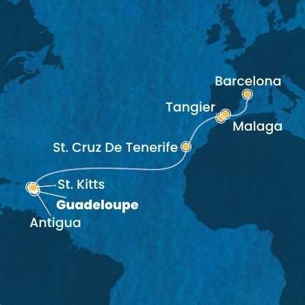 Guadeloupe, Svatý Kryštof a Nevis, Antigua a Barbuda, Španělsko, Maroko z Pointe-à-Pitre na lodi Costa Favolosa