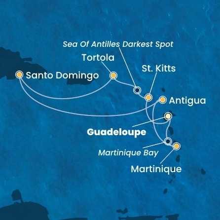 Guadeloupe, Svatý Kryštof a Nevis, Britské Panenské ostrovy, Dominikánská republika, Antigua a Barbuda, Martinik z Pointe-à-Pitre na lodi Costa Favolosa