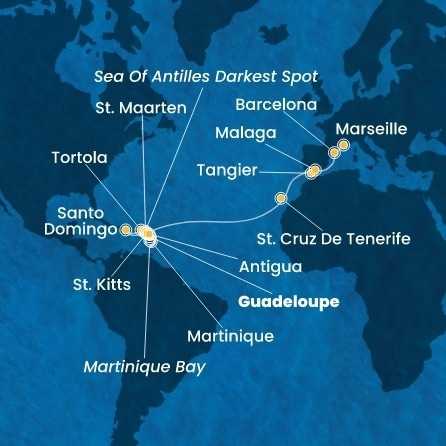 Guadeloupe, Svatý Kryštof a Nevis, Britské Panenské ostrovy, Dominikánská republika, Svatý Martin, Martinik, Antigua a Barbuda, Španělsko, Maroko, Francie, Itálie z Pointe-à-Pitre na lodi Costa Favolosa