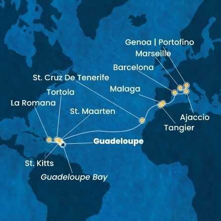 Guadeloupe, Svatý Kryštof a Nevis, Britské Panenské ostrovy, Dominikánská republika, Svatý Martin, Španělsko, Maroko, Francie, Itálie z Pointe-à-Pitre na lodi Costa Fascinosa