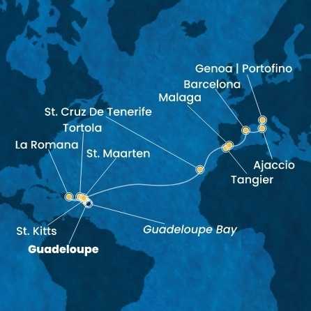 Guadeloupe, Svatý Kryštof a Nevis, Britské Panenské ostrovy, Dominikánská republika, Svatý Martin, Španělsko, Maroko, Francie, Itálie z Pointe-à-Pitre na lodi Costa Fascinosa