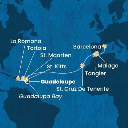 Guadeloupe, Svatý Kryštof a Nevis, Britské Panenské ostrovy, Dominikánská republika, Svatý Martin, Španělsko, Maroko z Pointe-à-Pitre na lodi Costa Fascinosa