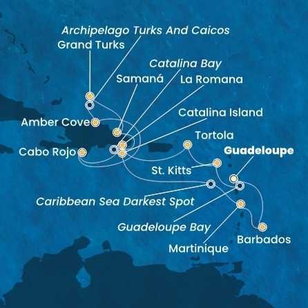 Dominikánská republika, Svatá Lucie, Barbados, Guadeloupe, Svatý Kryštof a Nevis, Britské Panenské ostrovy, Zámořské území Velké Británie z La Romany na lodi Costa Fascinosa