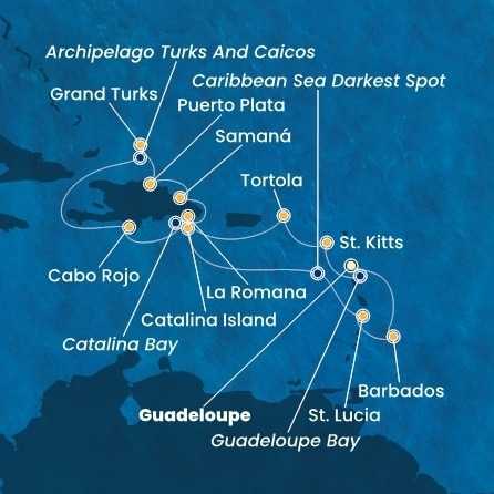 Guadeloupe, Svatý Kryštof a Nevis, Britské Panenské ostrovy, Dominikánská republika, Zámořské území Velké Británie, Svatá Lucie, Barbados z Pointe-à-Pitre na lodi Costa Fascinosa
