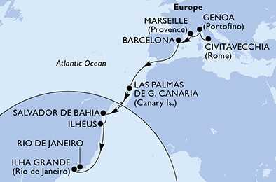 | Den 14 | Salvador, Brazílie, (připlutí: 13:00 | odplutí: 21:00) |