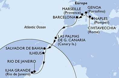 | Den 15 | Salvador, Brazílie, (připlutí: 13:00 | odplutí: 21:00) |