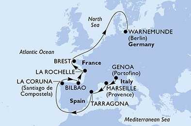 | Den 8 | La Rochelle (Bordeaux), Francie, (připlutí: 07:00 | odplutí: 17:00) |