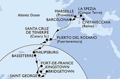 | Den 16 | Basseterre, Svatý Kryštof a Nevis, (připlutí: 07:00 | odplutí: 18:00) |