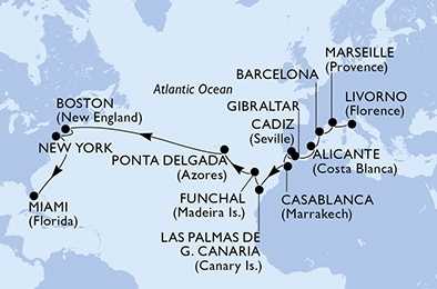 | Den 13 | Ponta Delgada, Azorské ostrovy, (připlutí: 00:01 | odplutí: 19:00) |