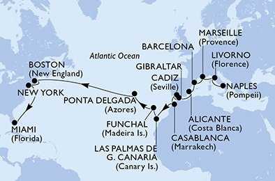 Itálie, Francie, Španělsko, Velká Británie, Maroko, Portugalsko, USA z Neapole na lodi MSC Meraviglia