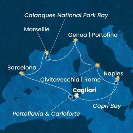 Trasa plavby program Den 1 Cagliari, Sardinie, (připlutí: | odplutí: 16:00) Den 2 Neapol, Itálie, (připlutí: 08:30 | odplutí: 17:30) Den 3 Svítání u ostrova Capri s pohledem na Faraglioni / Itálie Den 4 Civitavecchia, Itálie, (připlutí: 08:00 | odplutí: 18:30) Den 5 Janov, Itálie, (připlutí: 08:30 | odplutí: 17:00) Den 6 Proplouvání zálivem Národního parku Calanques / Francie Den 7 Marseille, Francie, (připlutí: 09:00 | odplutí: 18:00) Den 8 Barcelona, Španělsko, (připlutí: 08:00 | odplutí: 18:00) Den 9 Západ slunce u Porto Flavia a Carloforte / Itálie Den 10 Cagliari, Sardinie, (připlutí: 07:00 | odplutí: )