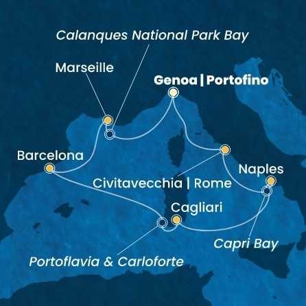 Trasa plavby program Den 1 Janov, Itálie, (připlutí: | odplutí: 17:00) Den 2 Proplouvání zálivem Národního parku Calanques / Francie Den 3 Marseille, Francie, (připlutí: 09:00 | odplutí: 18:00) Den 4 Barcelona, Španělsko, (připlutí: 08:00 | odplutí: 18:00) Den 5 Západ slunce u Porto Flavia a Carloforte / Itálie Den 6 Cagliari, Sardinie, (připlutí: 07:00 | odplutí: 16:00) Den 7 Neapol, Itálie, (připlutí: 08:30 | odplutí: 17:30) Den 8 Svítání u ostrova Capri s pohledem na Faraglioni / Itálie Den 9 Civitavecchia, Itálie, (připlutí: 08:00 | odplutí: 18:30) Den 10 Janov, Itálie, (připlutí: 08:30 | odplutí: )