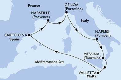 | Den 7 | Marseille, Francie, (připlutí: 08:00 | odplutí: 17:00) |