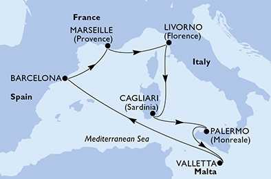 | Den 7 | Marseille, Francie, (připlutí: 08:00 | odplutí: 16:00) |