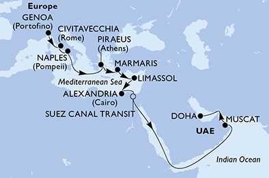 | Den 11 | Plavba Suezským průplavem, Egypt, (připlutí: 15:00 | odplutí: 15:30) |