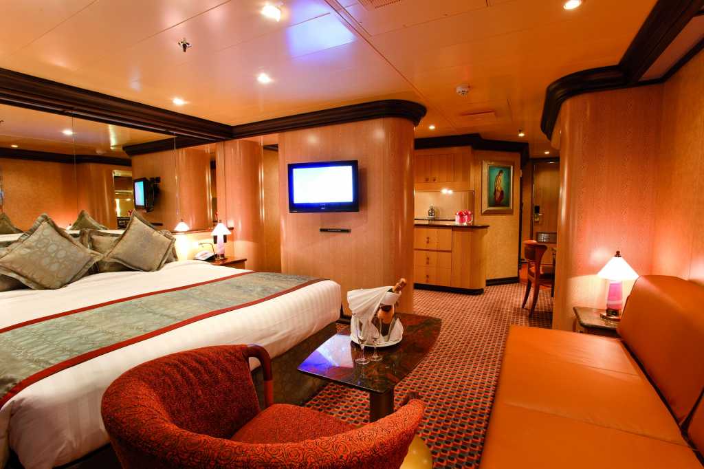 Ubytování v kajutě vybrané kategorie. Kajuty jsou vybavené samostatným sociálním zařízením, klimatizací, TV, minibarem, šatní skříní, kosmetickým stolkem, vysoušečem vlasů, trezorem a telefonem. Přístavní poplatky, portýrské služby při nalodění a vylodění, denní úklidový servis a výhody Vámi zvolené třídy ubytování.