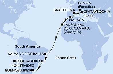 | Den 15 | Salvador, Brazílie, (připlutí: 12:00 | odplutí: 19:00) |