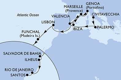 Itálie, Španělsko, Francie, Portugalsko, Brazílie z Civitavecchia na lodi MSC Musica
