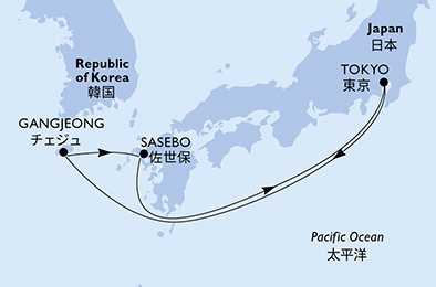 | Den 3 | Gangjeong, Jižní Korea, (připlutí: 13:00 | odplutí: 21:00) |