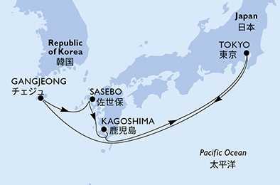 | Den 3 | Gangjeong, Jižní Korea, (připlutí: 13:00 | odplutí: 21:00) |