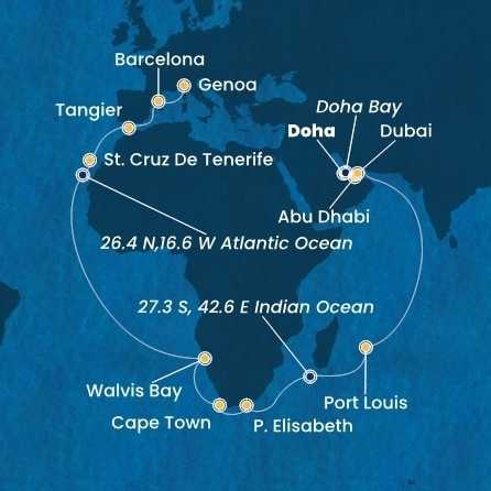 Katar, Spojené arabské emiráty, Mauricius, Jihoafrická republika, Namibie, Španělsko, Maroko, Itálie z Dohy na lodi Costa Smeralda